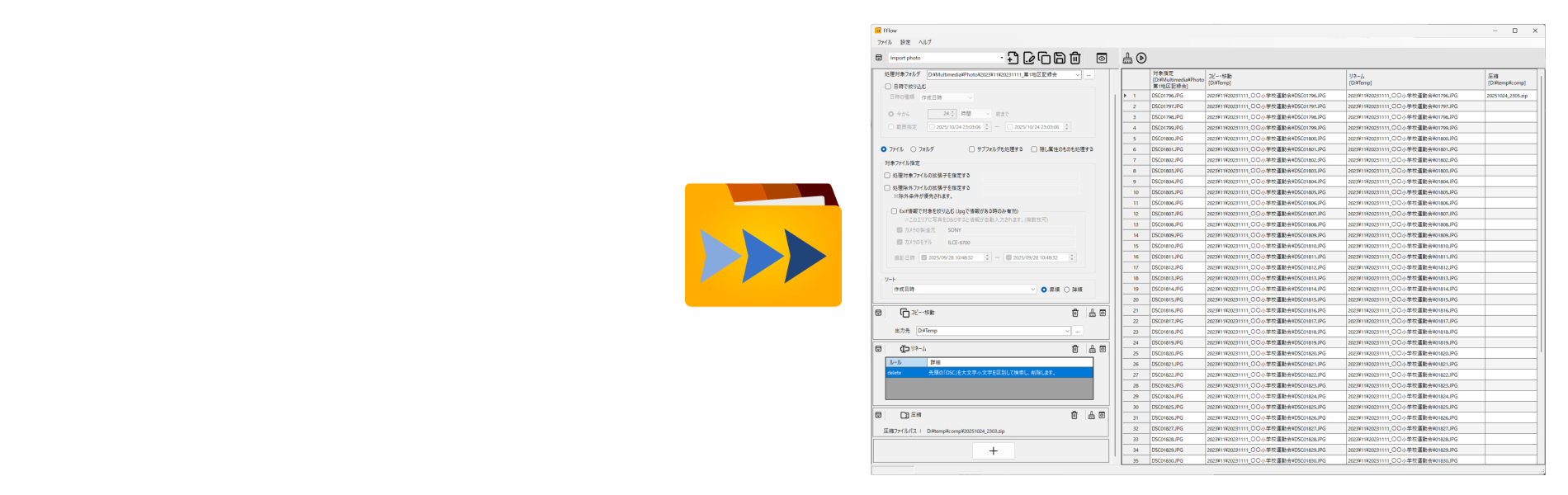 FFlowはファイルやフォルダに対して毎回行う決まった操作を、1クリックで行えるようにするWindows11用アプリケーションです。あらかじめ作成したルールに従い、ファイル(またはフォルダー)のコピー、移動、削除、リネーム、圧縮などの一連の操作を自動で実行します。