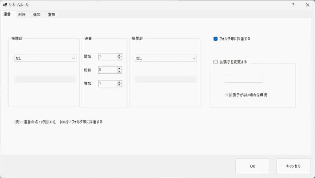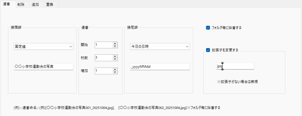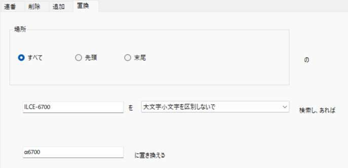 | 末尾 | ファイル名の末尾に指定文字列があれば、その部分を置換します。 |