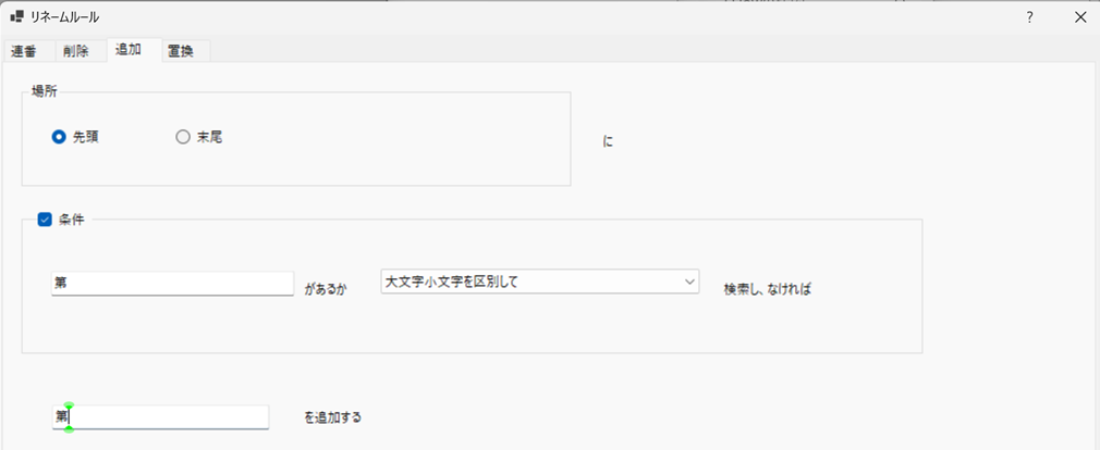 | 先頭 | ファイル名の先頭に指定文字列を追加します。 |