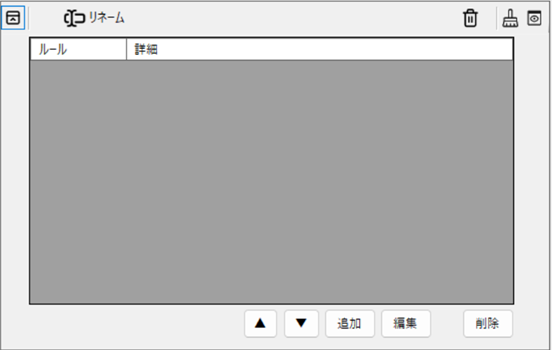 上図はリネームタスクを追加した直後の画面です。まだリネームのルールが一つもないのでリストは空欄です。[追加]ボタンを押してリネームルールを追加します。