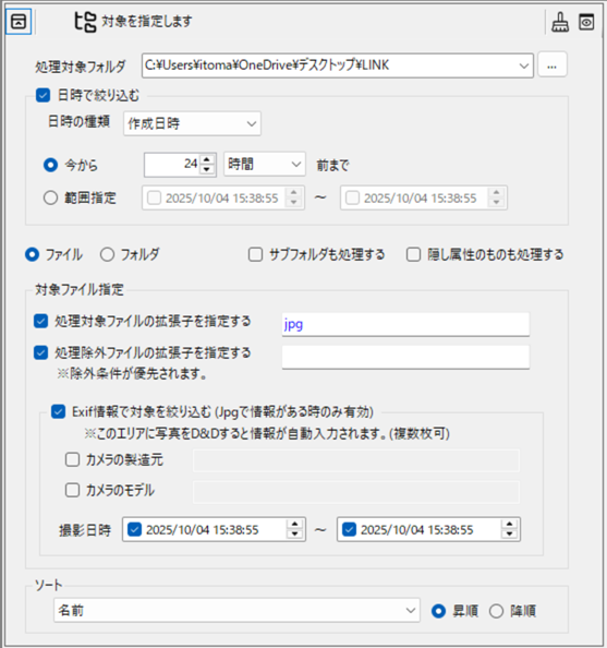Exif情報を使って対象を選別したい場合はチェックをONにします。ここでの設定はExif情報を持つファイルのみ有効です。